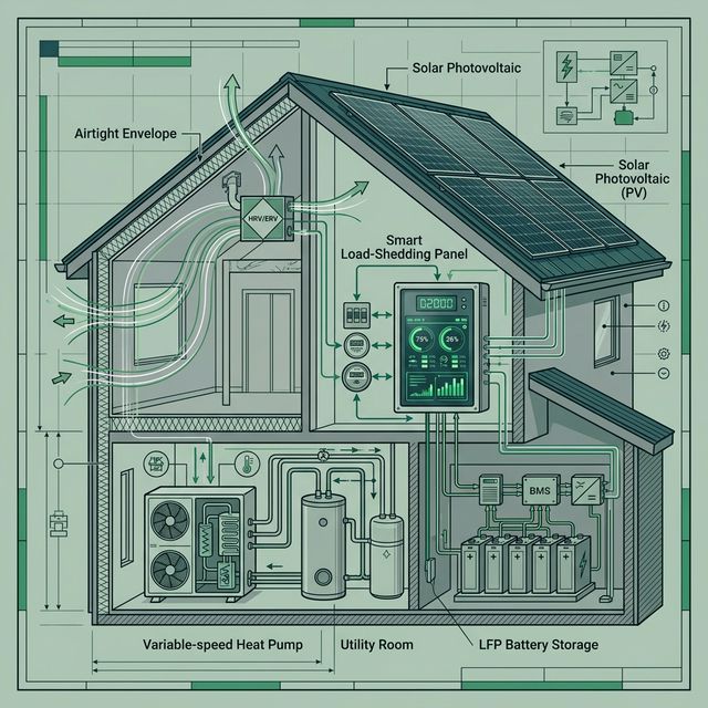 A technical blueprint showing a 2026 "Sovereign Home." The image highlights the layer-by-layer efficiency: 1. Airtight envelope with HRV flow. 2. Variable-speed heat pump with thermal storage. 3. Smart load-shedding panel. 4. Rooftop solar with LFP storage. The aesthetic is clean, technical, and high-authority.